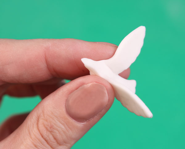 Kavla ut pastan och gör ett utstick. Tryck sedan ner knappen på utstickaren mot arbetsunderlaget så att kropp och vingar sammanfogas. Använd sedan knappen för att frigöra utsticket.