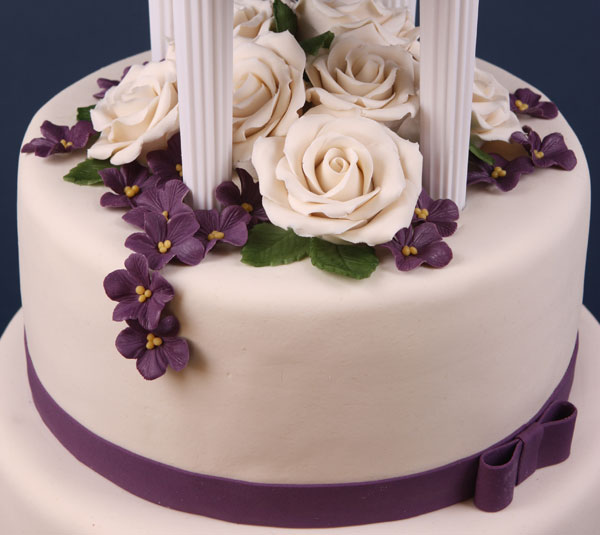 Så var det då helg igen, och dags för nya bröllopstårtor. Först ut var denna, som hämtades i går kväll. Det är en tårta i 4 våningar. Mycket stiligt och effektfullt med det mörkt lila mot det vita. Senare under dagen så finns bild på hela tårtan i galleriet.
